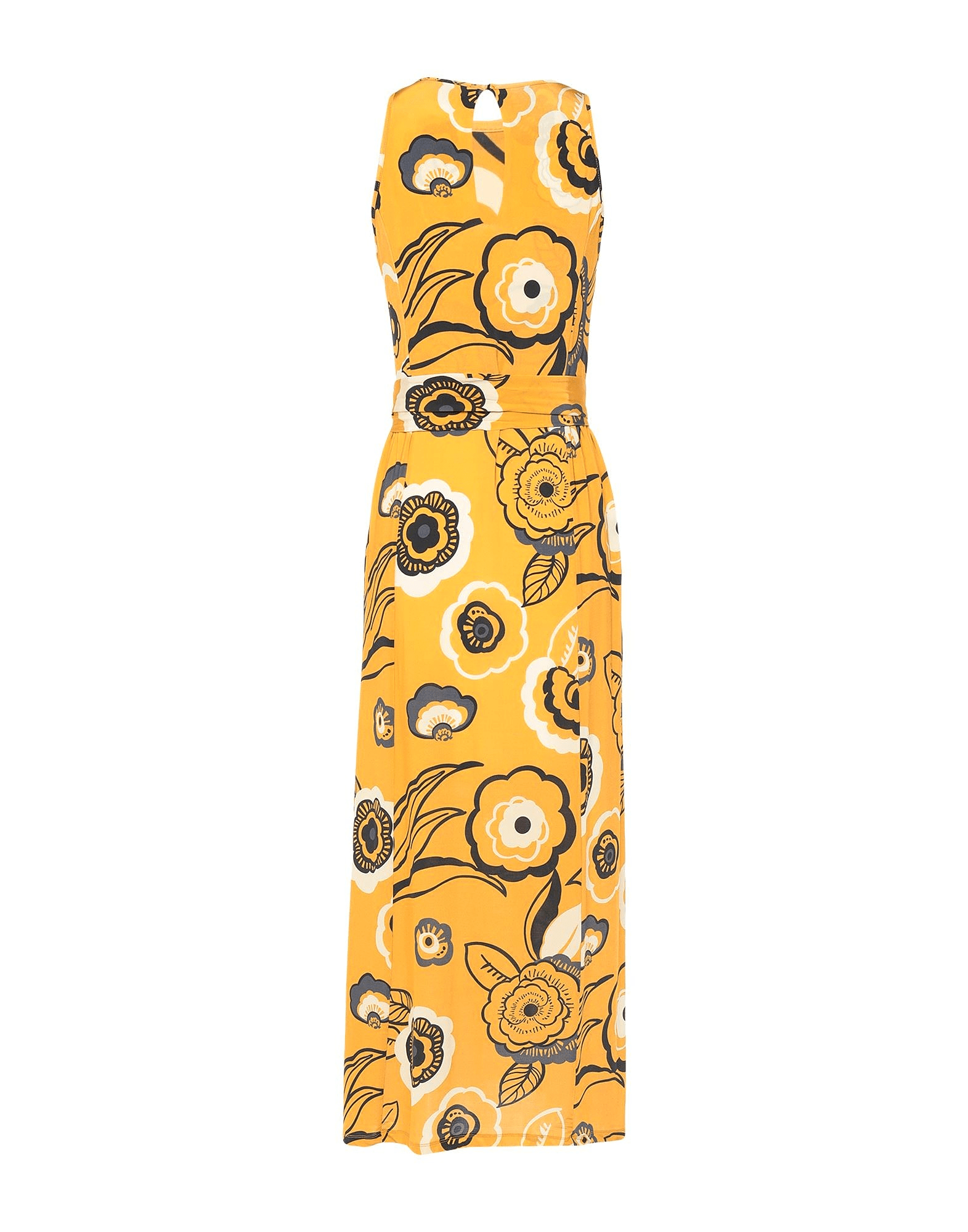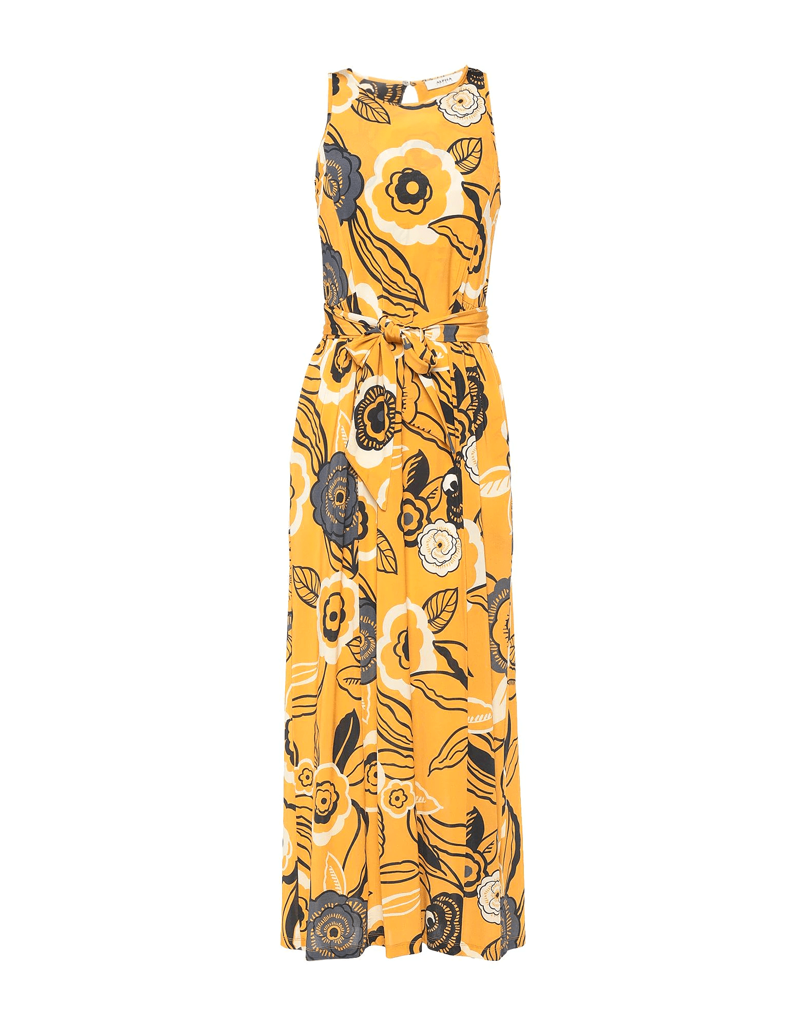 Alpha Studio jersey long dress has a beautiful floral print, a round neckline with a button closing at the back, sleeveless, and no pockets.