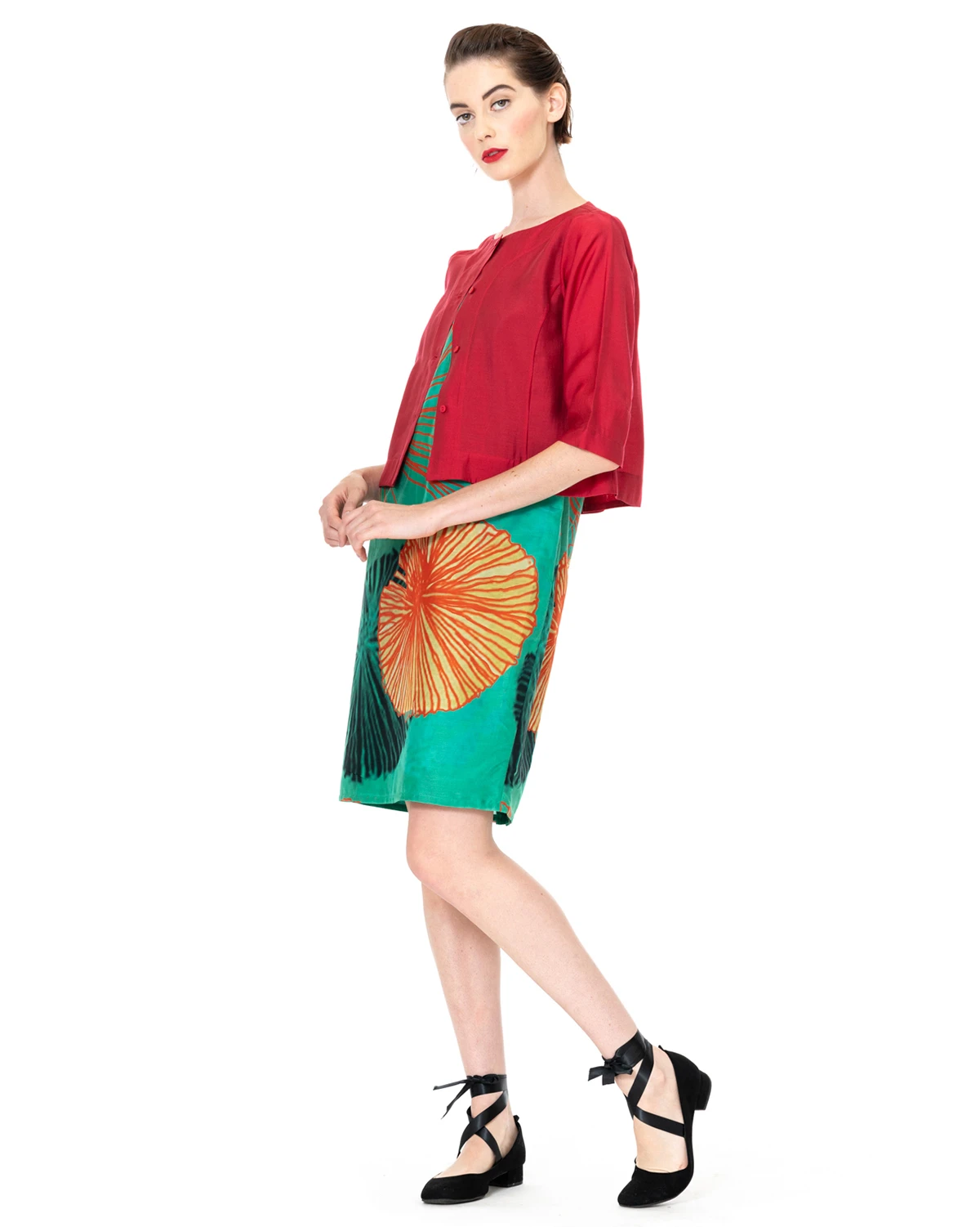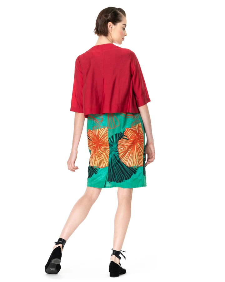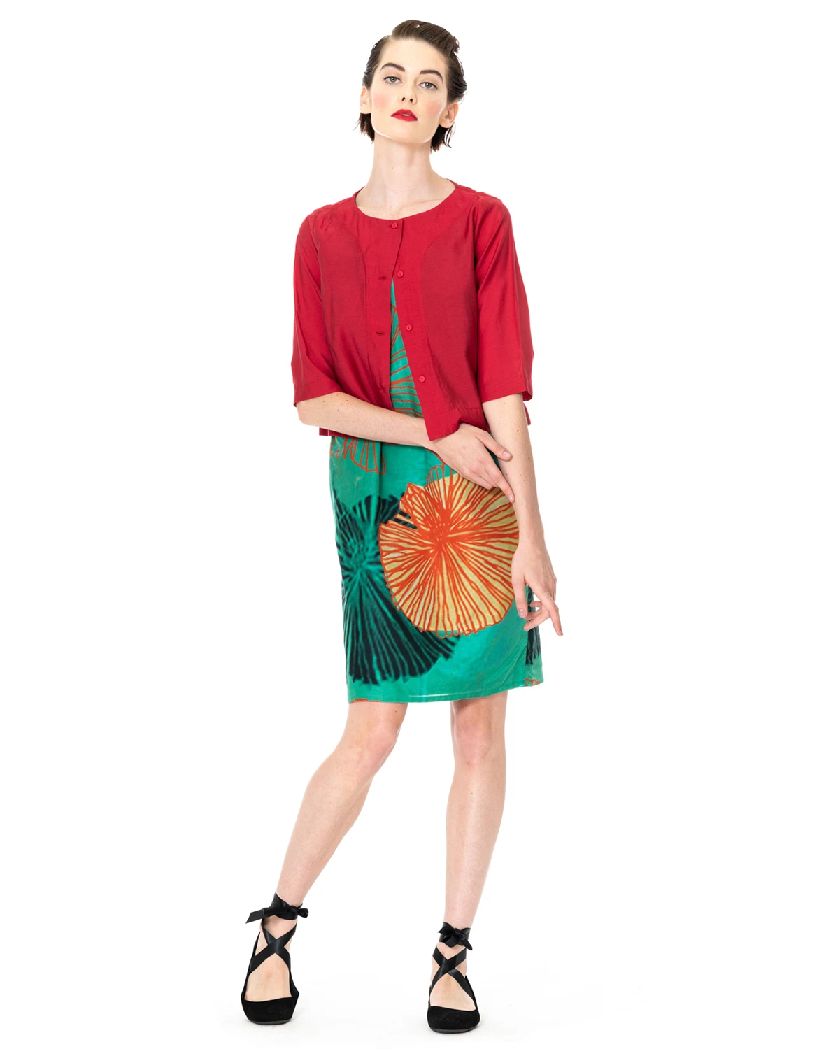 Our Bamboo Jacket is a short jacket with three quarter sleeves and a small boat neckline. It is a lovely clean shape that is an easy style to pair with your summer wardrobe. Made in our bamboo fabric which is soft and has a subtle shine to it. It comes with red colour, this jacket feels and looks divine.