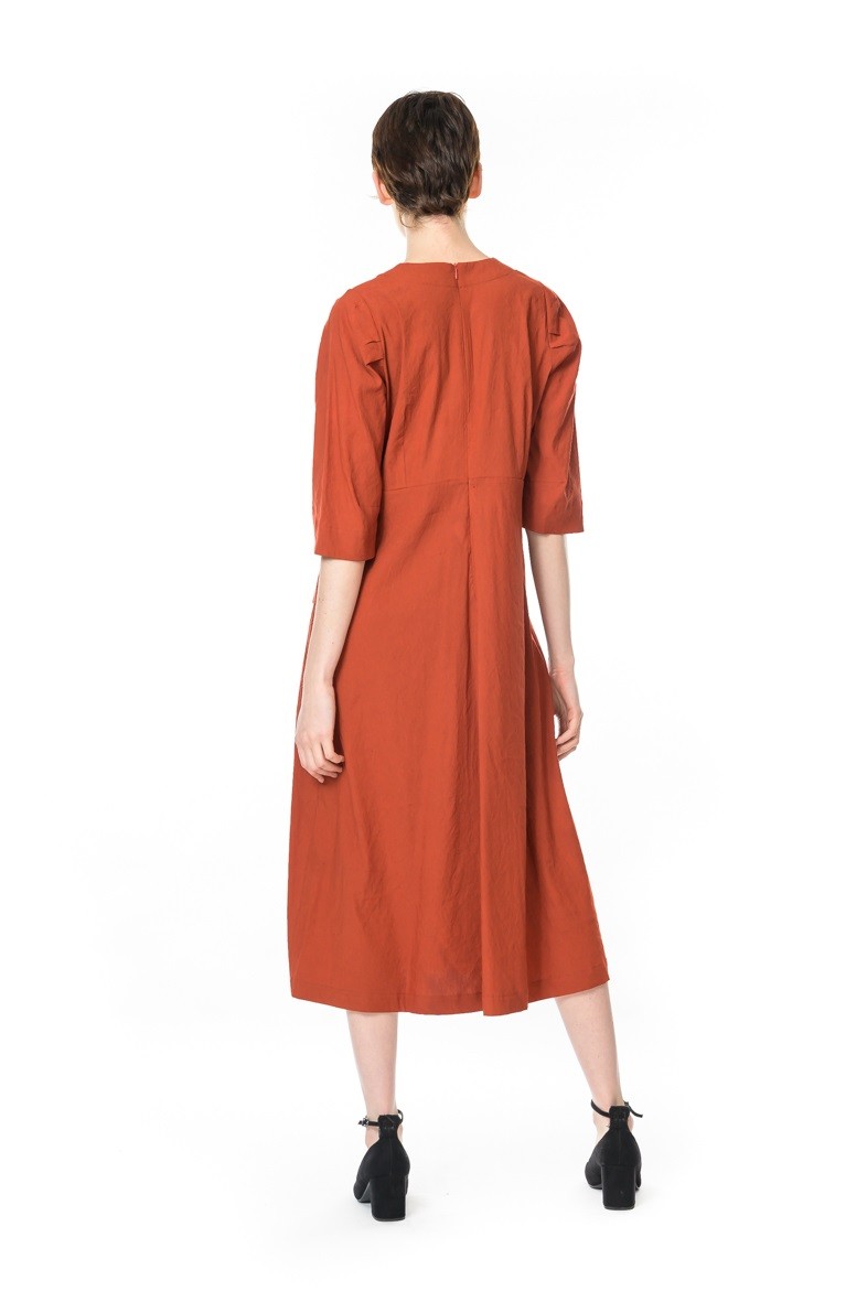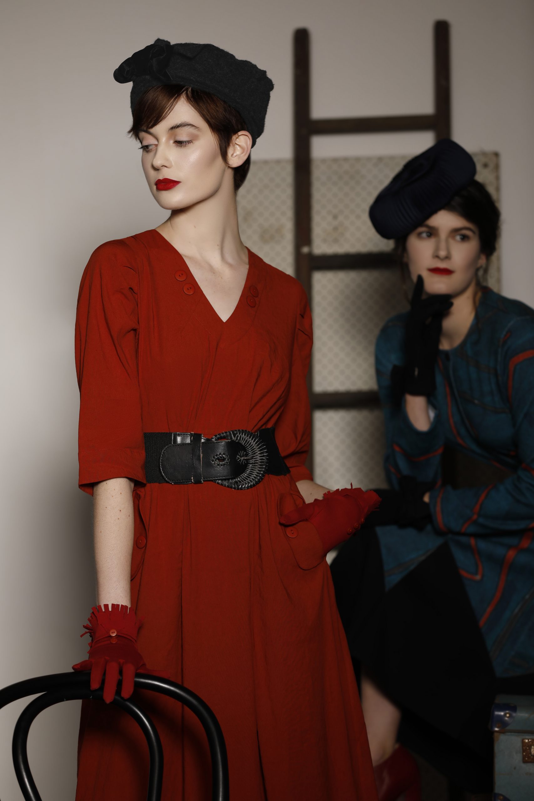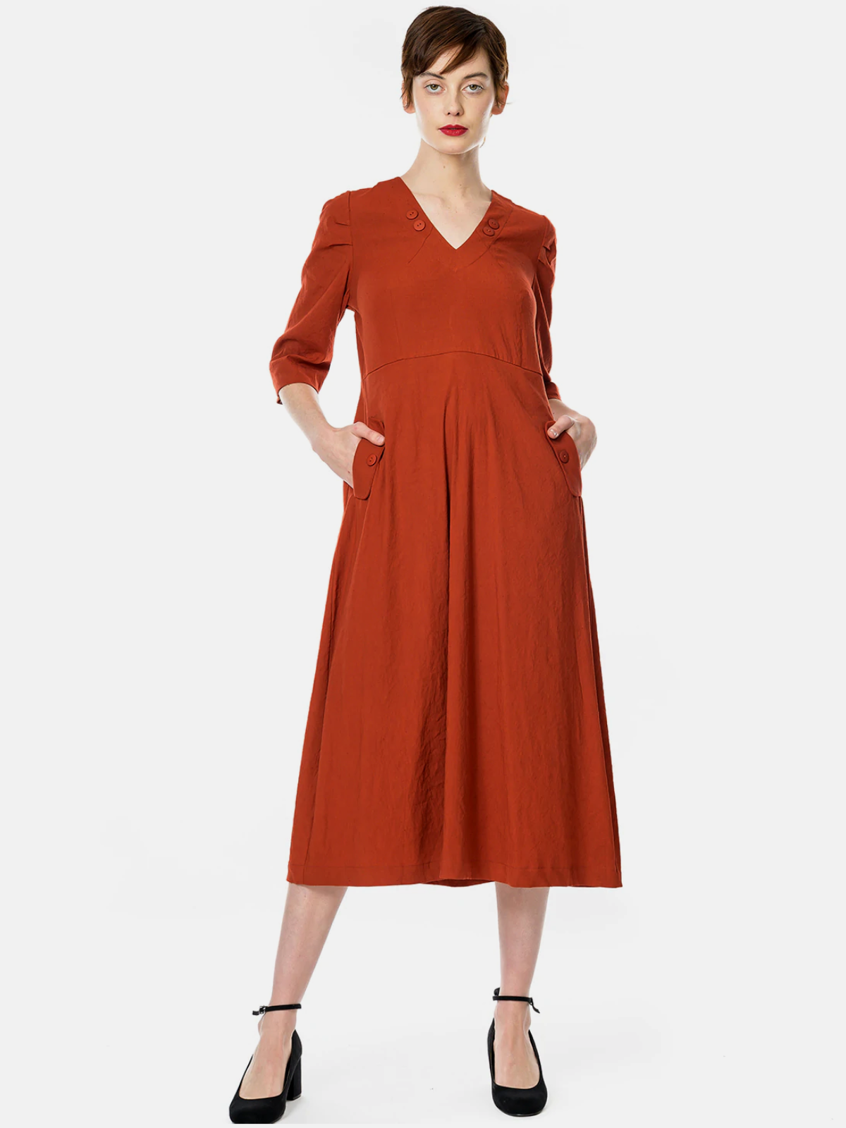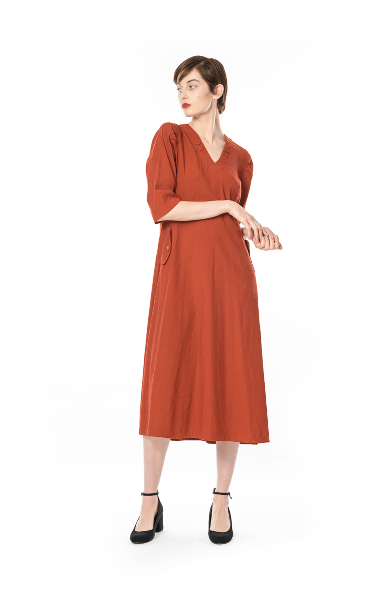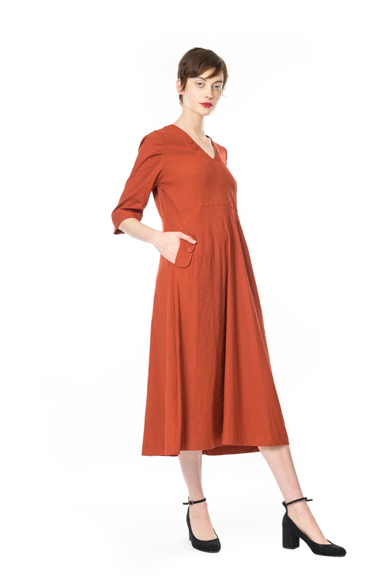 Delivering all the 40s style that Enigma promises, the 40s dress plays with a gorgeously classic shape, 3/4 sleeves and a mid calf hemline, a tailored waist and we just adore the folded pocket flaps and neckline feature buttons. made in a ‘Megan Salmon’ favourite material – somersault which is a blend linen, rayon and spandex. This material gives us this beautiful blend that has all those textural qualities we love about natural linen, the crease reductive qualities of rayon and just a touch of stretch thanks to the spandex. This style brings a feminine and vintage flare!