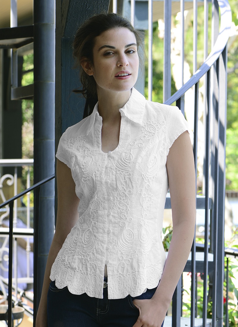 Pure cotton embroidered blouse with collar and cap sleeves. Hidden stretch panels complete the look.