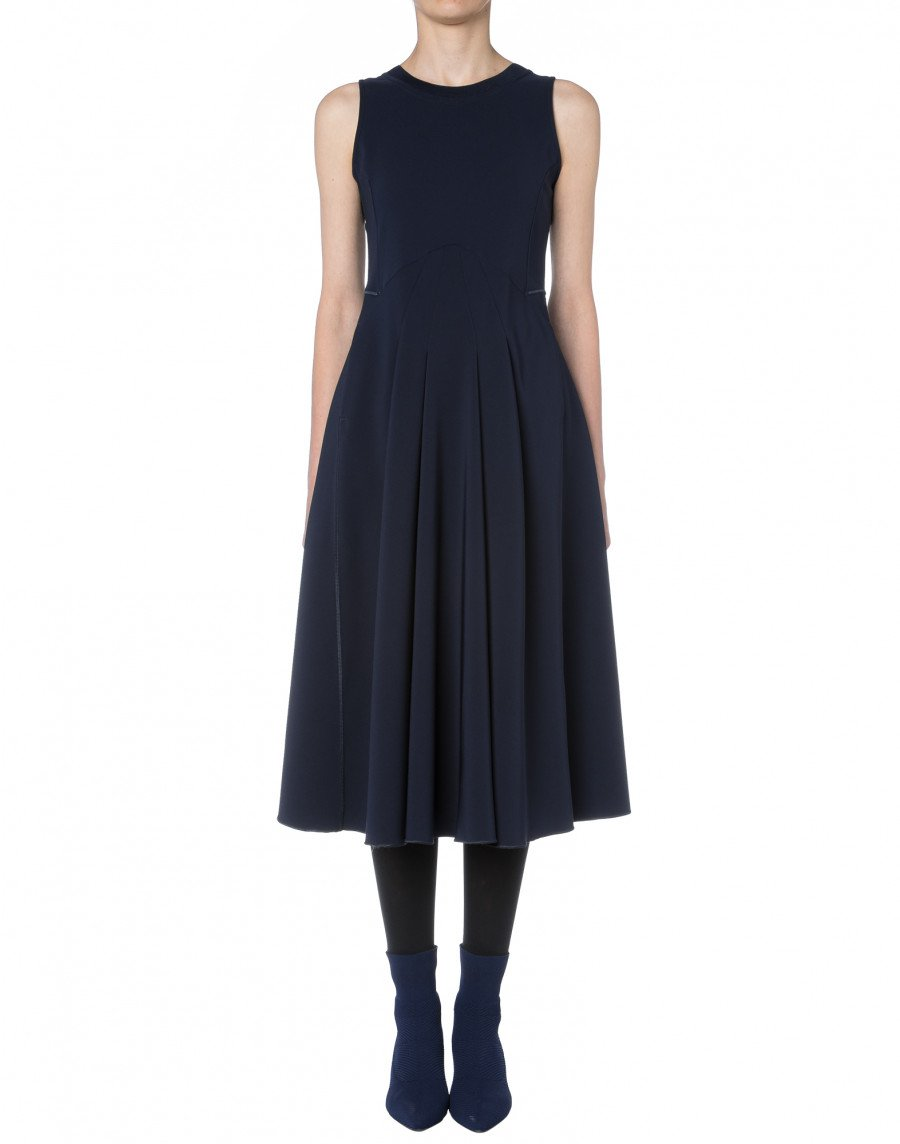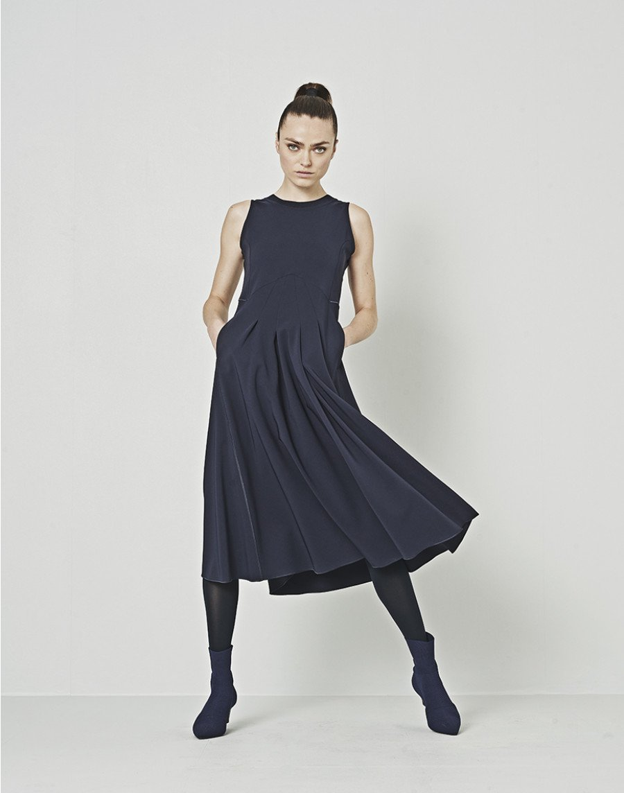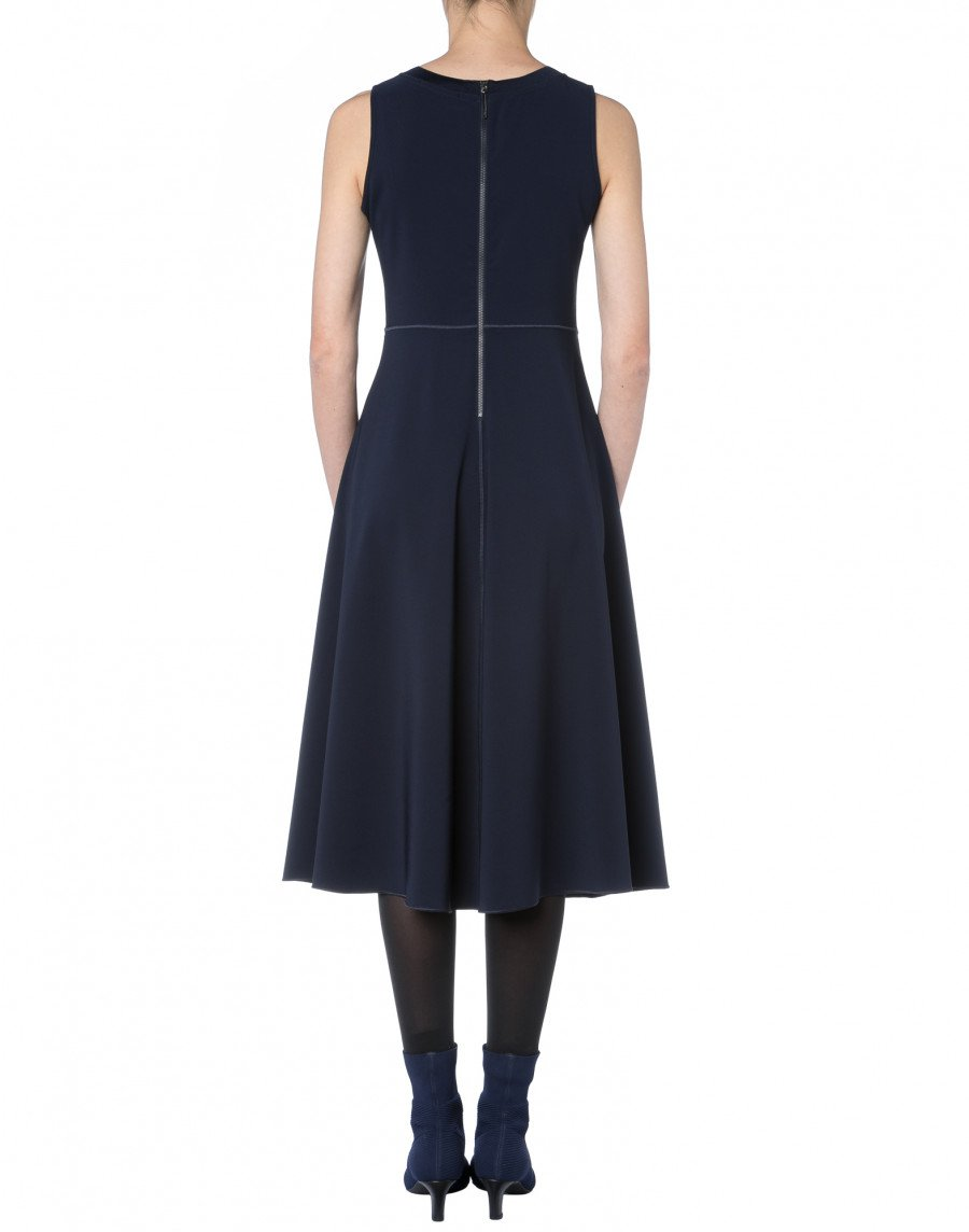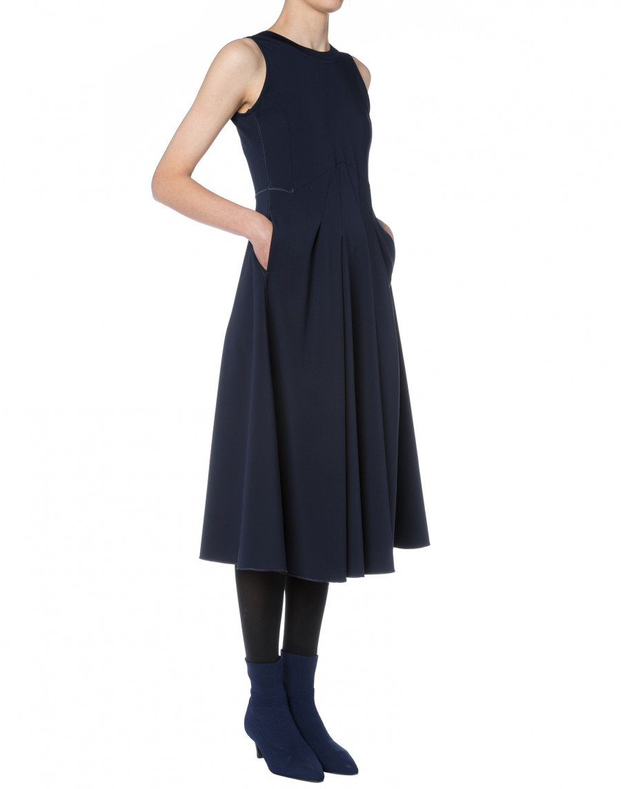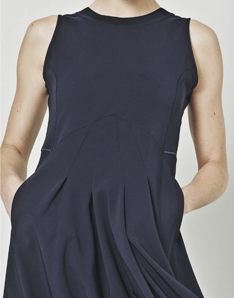 Full skirted sleeveless dress in navy technical jersey with round neck and armholes bound in tech-satin. Fastened down the back with a nylon zip. Front panel has high waistline in an inverted V-shape at centre front over inverted pleats creating a fullness in the front of a full flaring skirt. Inseam side pockets. Inseam side pockets. Reverse has back waist seam and fit seams. Full straight hem.
