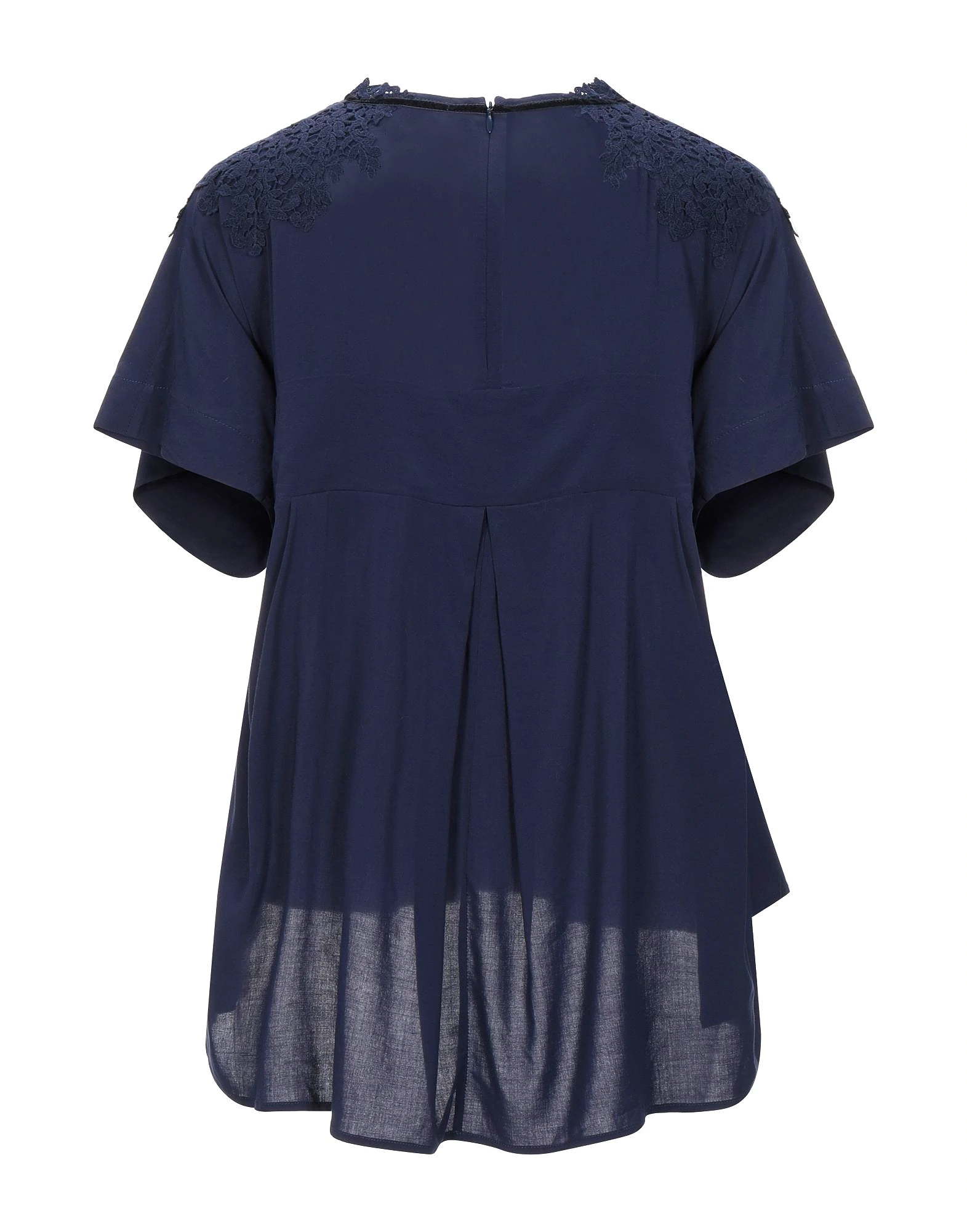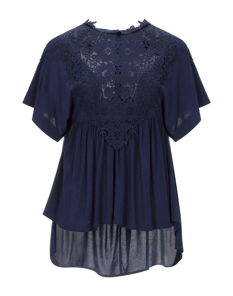 Lace, plain weave, logo, solid color, rear closure, zipper closure, short sleeves, round collar, no pockets, stretch.