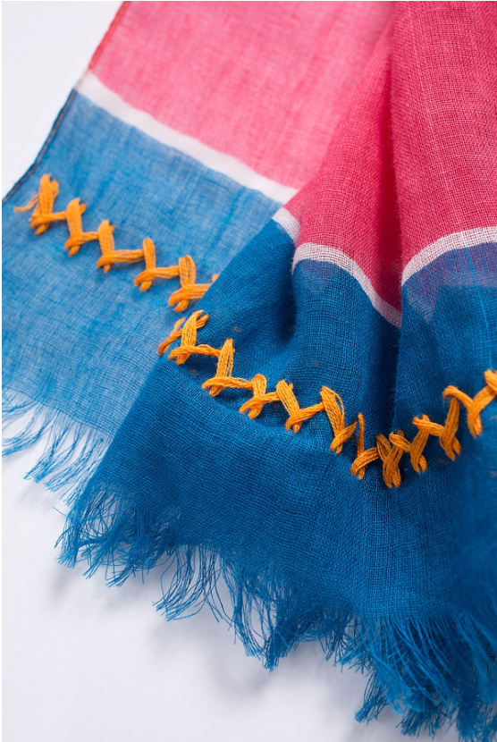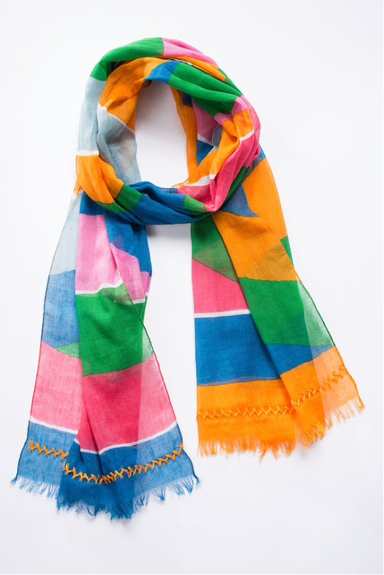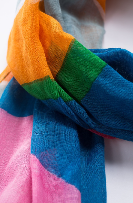A mix of glowing colours gives this airy light ISCHKO scarf its signal effect. It’s beautiful with all tops, shirts and dresses from the current ISCHKO collection – and a great eye-catcher when you sling this scarf casually around your head. Cotton embroidery adorns the scarf ends. Delicate cotton, printed with this season´s colourful “Regatta-print“ in graphic stripes, embellished with embroidered edges, exclusive to ISCHIKO.