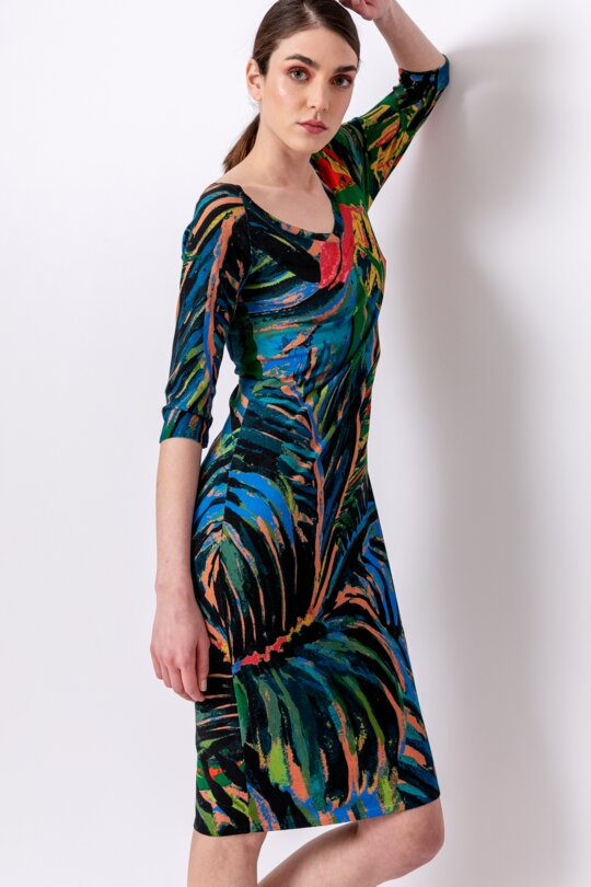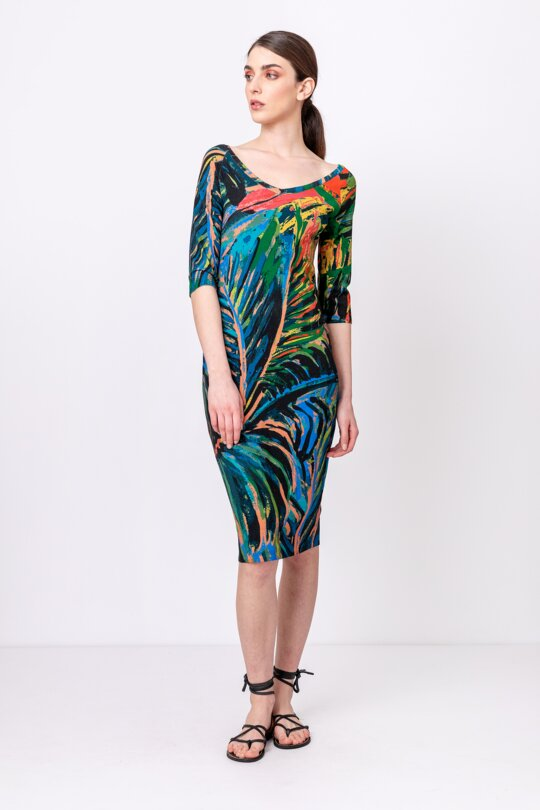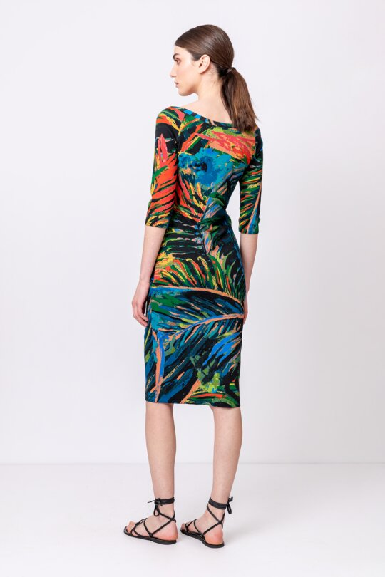 Ultra slim-fitting dress that wonderfully accentuates your curves, adorned with a glamorous jungle motif spreading all around and wide V neckline that adds some irresistible, sexy vibe.