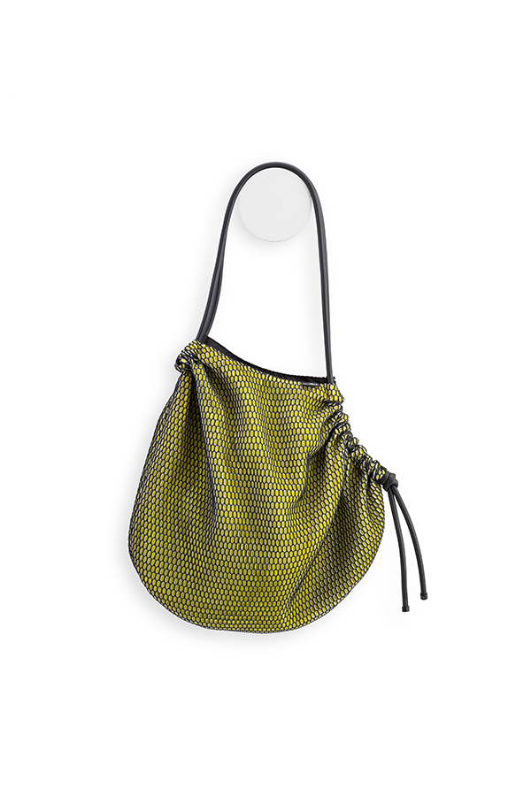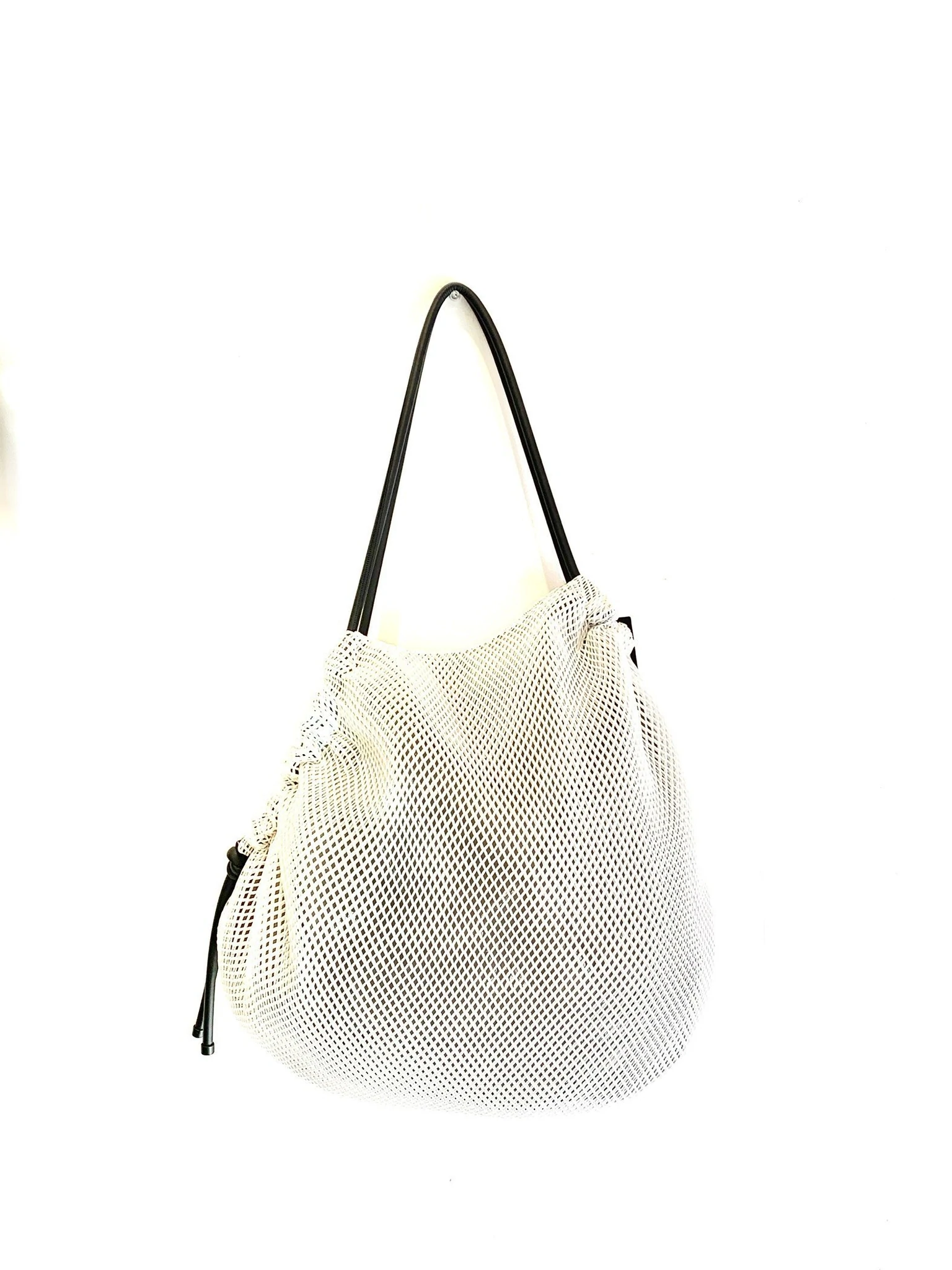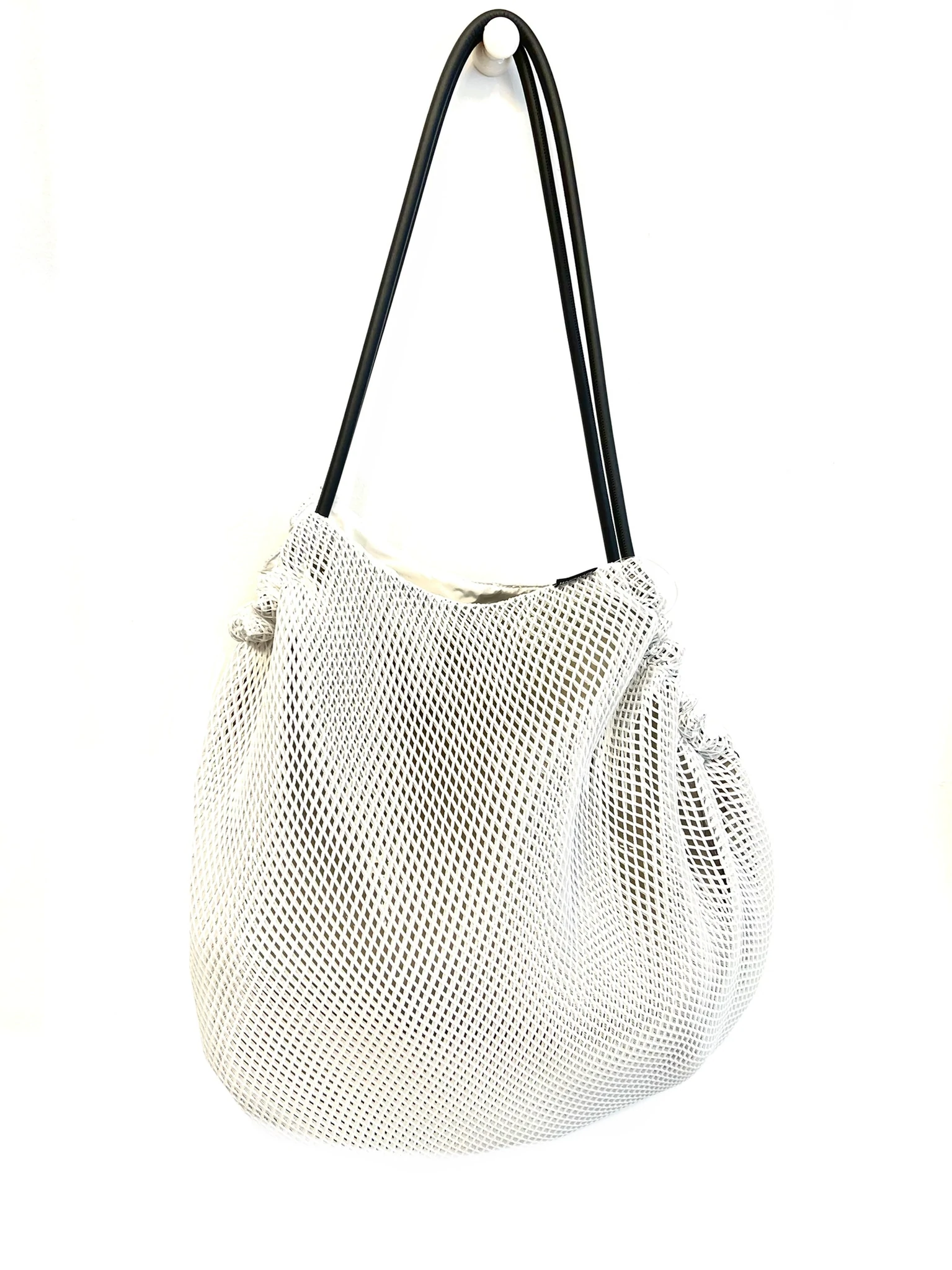 This bag is made of nylon mesh net over a waterproof vinyl core creating a super light weight. The straps are made from super strong and soft neoprene tubes. Adjust the strap length by re-knotting the drawstring end.