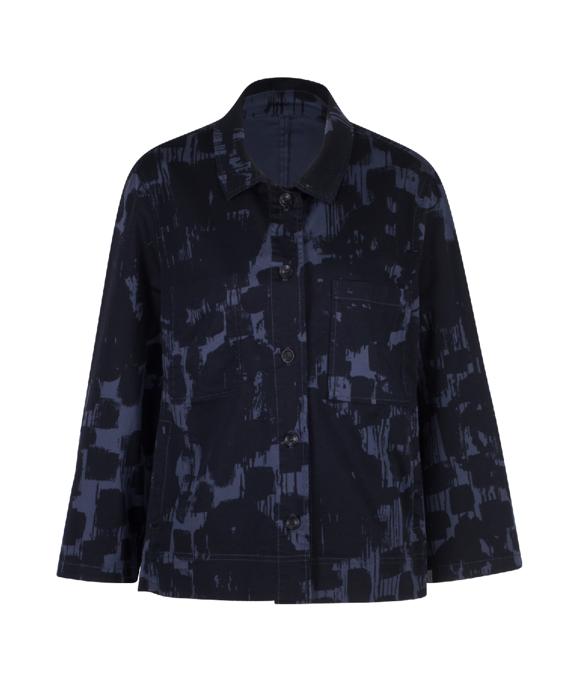 Super-stretch cotton twill printed with camouflage-like brushstrokes, innovative pigment-dye effects, garment-dyed. Attention: Irregularities in dyeing and stressed edges are characteristic for this quality.