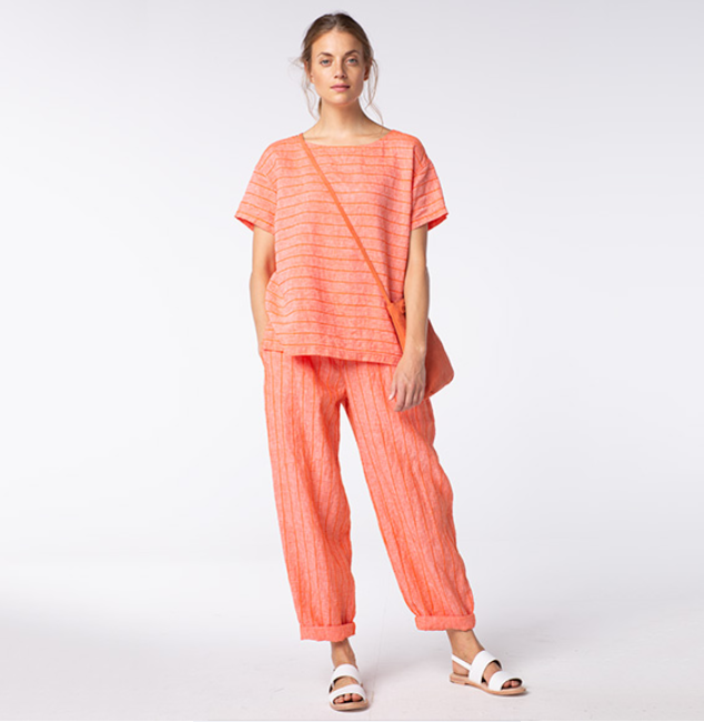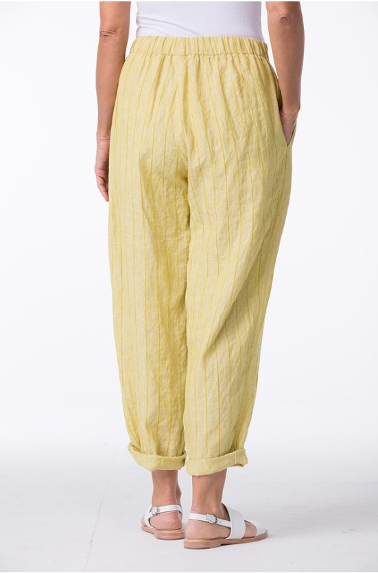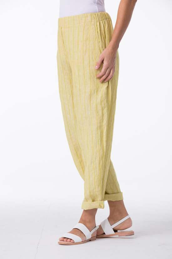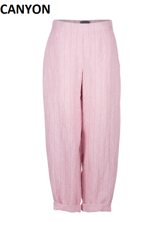 These OSKA trousers are an everyday piece – super casual, ultra-comfortable, and versatile in combination with all tops. Their moderate loose-fitting cut with conically tapered legs create a relaxed, attractively feminine silhouette. To accentuate the casual look, turn up the hems. An elastic waistband and pockets stand for sporty comfort. Pinstripes in pure Irish linen, garment-washed, exclusive at Oska.