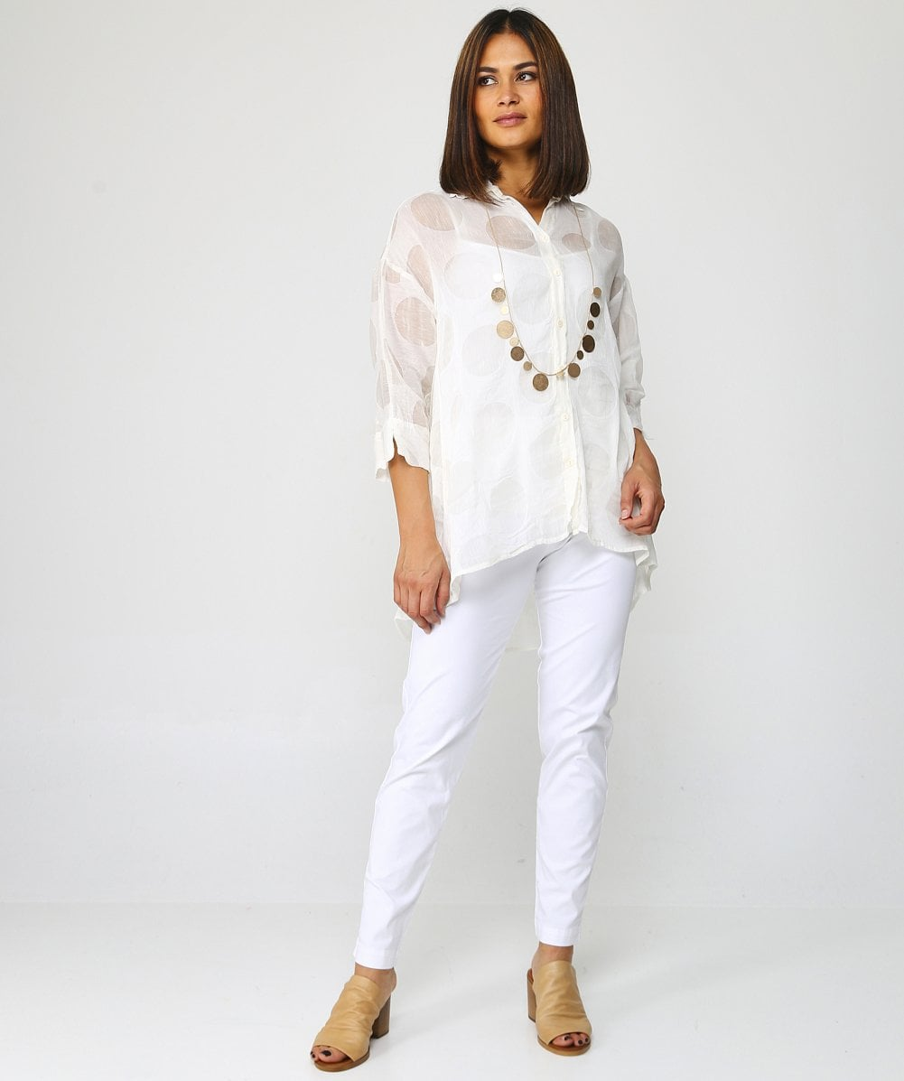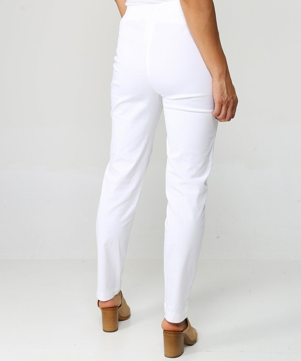 These OSKA trousers conjure up a wonderful silhouette. Thanks to the support of two darts they have a beautifully narrow fit at the hips; yet an elastic waistband offers enough freedom of movement to make you feel comfortable at any time. The trouser legs taper off slightly conically. Beautiful with flat sandals and sneakers: turned up trouser-legs. Soft super-stretch piqué, innovative pigment-dye effects, garment-dyed. Attention: Irregularities in dyeing and stressed edges are characteristic for this quality