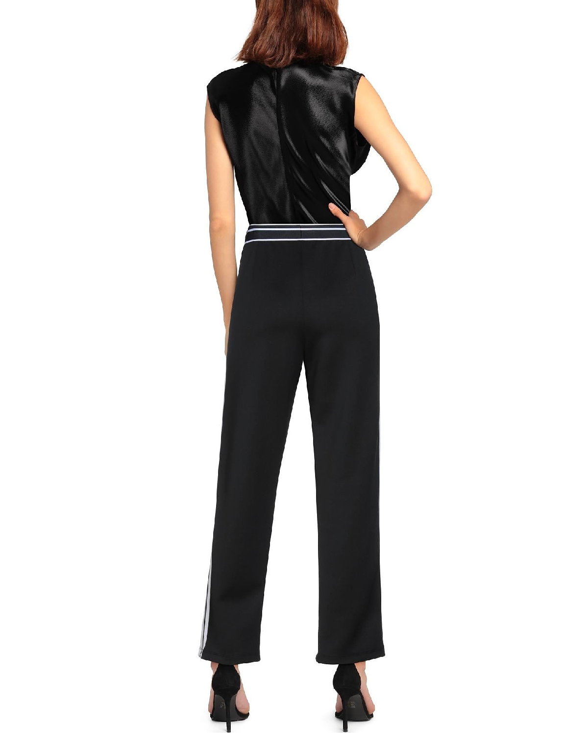 Grosgrain, jersey, two-tone, side seam stripes, brand logo, high waisted, comfort fit, straight leg, elasticized waist, multi-pockets, stretch.