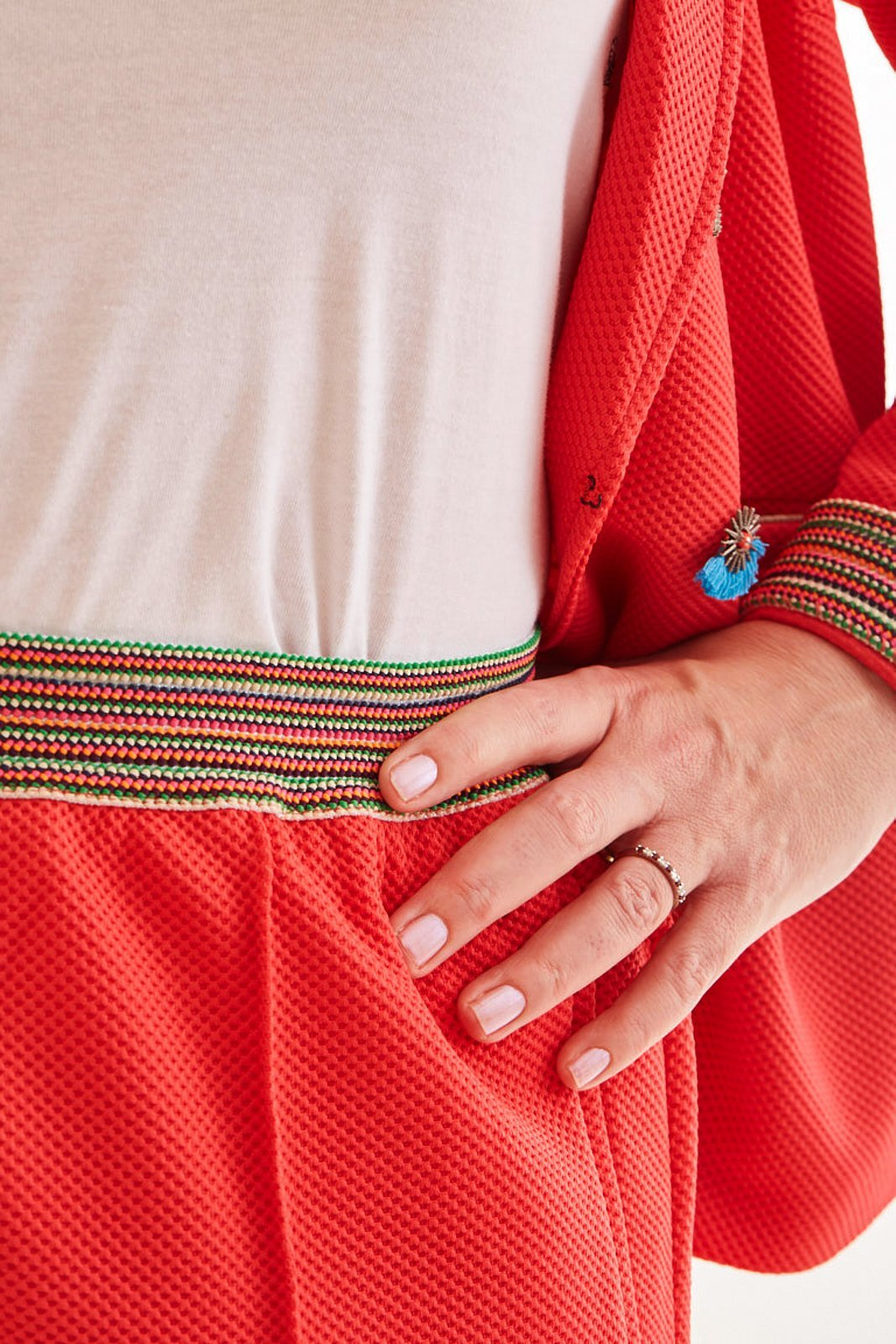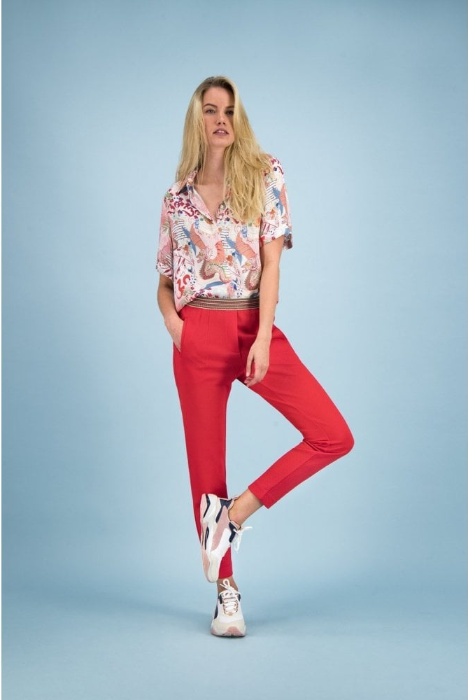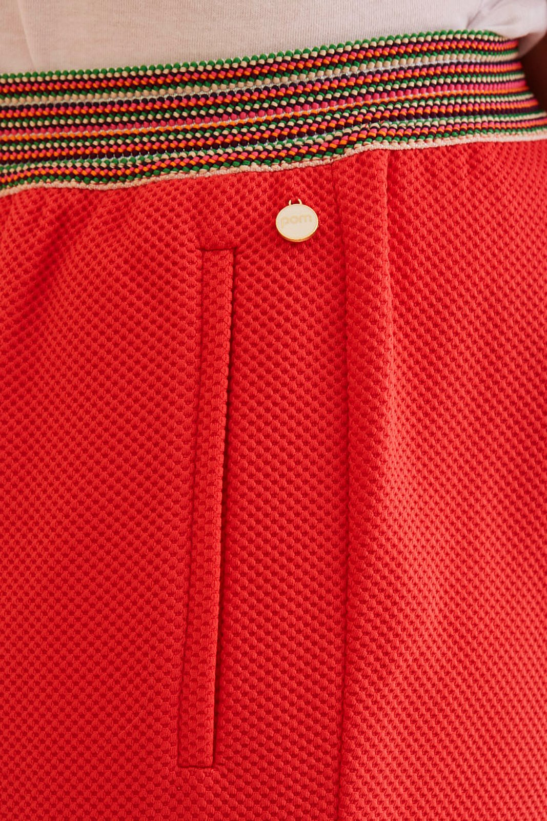 We promise these pants will bring you more than just luck, they guarantee to steal the show. The cropped trousers have been cut from a lightweight stretch piqued texture fabric in a romantic shade of raspberry-red, offering a flattering fit that accentuate the silhouette. The cut gives praise to the multi-colour elastic band that create soft pleats that offer a further flattering cut against the body finished with side welted pockets.