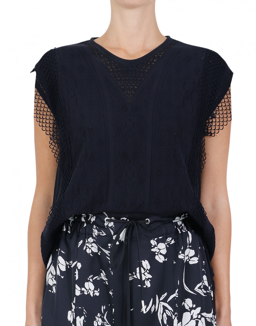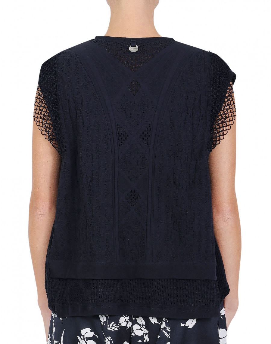 Multiple geometric patterned body with semi-sheer V shape panel at centre front and back, stretch “net” knit at side body panels and hem. Bands of technical scallop pattern mesh lace run over shoulder from front to back.